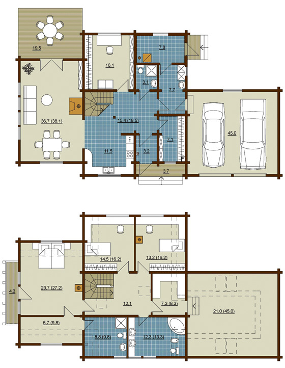 - Ārsienas un starpsienas no profilētām, frēzētām līmbrusām (biezums 120mm; 160mm, 200mm, 240mm vai 280mm). Pēc izvēles starpsienas no koka karkasa materiāla. Sienas ar krusta stūra vai dzeguļu stūra savienojumiem;
